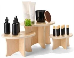 Looking to elevate your tabletop merchandise with a modern and minimalist design? These portable wood display risers are an eco-friendly option made from a lightweight poplar wood that is sure to help your company meet its sustainability goals. These risers have a flat pack design and collapsible build with no hardware required, making transportation and assembly quick and easy. Whether setting up at your next art festival or artisan trade show event, these units can be assembled in seconds. Showcase a multitude of products with our three distinct sizes, which allow you the flexibility to exhibit your products however you’d like. Stack the three tabletop units on top of each other to add some verticality to your products, or group them together to give each piece a spotlight of its own. Match our wood display risers with our other Dandelion products to create a cohesive and complete look!