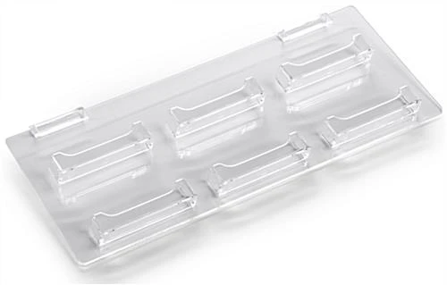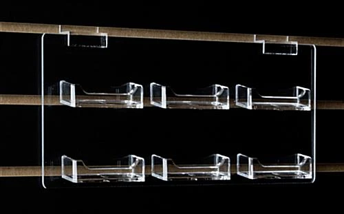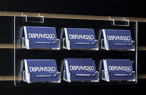 These business card holders, also known as slatwall accessories, are very popular at vet offices, pharmacies, convenient stores and much more. These slotwall fixtures, business card holders give choices to your customers, clients and guests. The pockets placed side by side facilitate the browsing of names, occupations, specialties and addresses. These business card holders display standard business cards measuring 3 ½”w x 2″h. The entire unit is fabricated out of durable plexiglass. Great value!