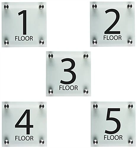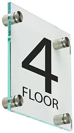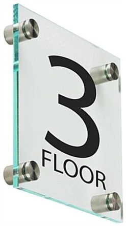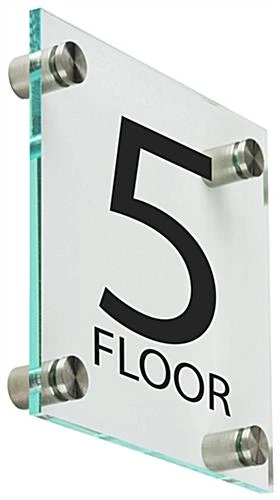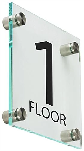 These floor-level signage displays will add an elevated professional aesthetic to your bank or corporate office. The identification signs include steel standoffs that affix to the wall and faceplate for a sleek modern appearance. The level signage displays for doors and hallways are beautiful and offer a green hue on the edges to give off a glass-like presentation. The signage provides bold lettering and numbers that are perfect for marking exit doors, elevators, or waiting areas.This signage offers a clean, modern design perfect for adding style and sophistication to your business.