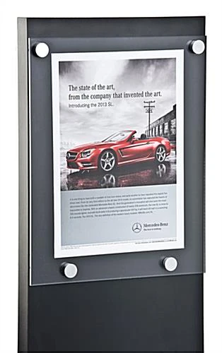 This double-sided acrylic floor stand for 8-1/2” x 11” material features an eye-catching black finish and a sturdy laminated MDF construction. This sign holder is sure to stand out in any environment while seamlessly coordinating with any décor. Each double-sided acrylic floor stand poster display includes (2) protective panels and (8) silver-finish standoffs. To present promotions, simply place the signage inside the transparent acrylic sheet, and twist on the (4) standoffs. The process can be repeated on the opposite side for showcasing (2) posters. This poster display, double-sided floor stand that is black could not be easier to use! This standing literature holder makes a great addition to a variety of environments. Use this double-sided acrylic floor stand in department stores to point shoppers in the right direction, or display a menu in the lobby of a restaurant for guests to peruse while waiting for a seat. This sign holder is also ideal for malls, community centers, movie theaters, and more. This sign display, double-sided floor stand that is 48-1/2” high is sure to catch the attention of potential customers seeking directional information.