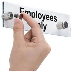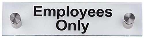 This “employees only” standoff sign is the perfect wall accessory for your business. Measuring in at 8”w x 2”h, the door display takes up little space while standing out with the bold lettering. The acrylic standoff sign mounts 0.75” from the wall so there is hardly any protrusion but enough to easily be seen. The door display includes 1” steel spacers for a clean modern look. Add these standoff signs to your business for a professional appearance. Each frame’s finish is perfectly cut with a green tint on the edge to enhance your rooms existing décor.