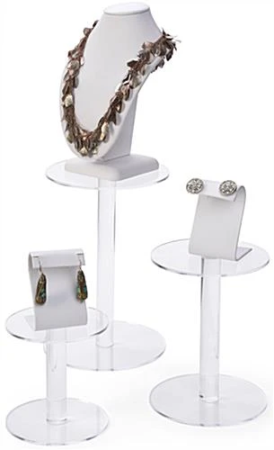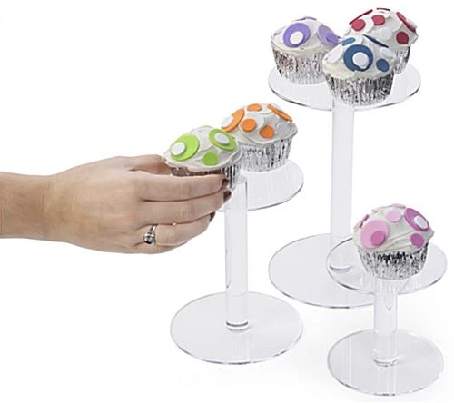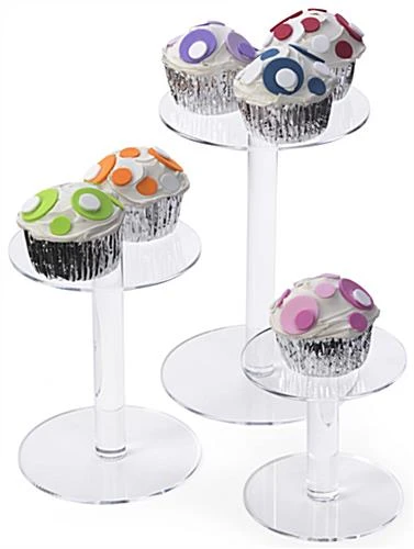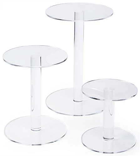 These acrylic pedestal risers are sold as a set of three pieces. Display boutique items such as jewelry or edibles like cupcakes on these store fixtures for a pristine presentation. Organize on counter or tabletops to create an eye catching arrangement with the 4โ, 6โ and 8โ tall round risers. Create elevation and put on display delicate products with these store fixtures which offer varying sizes. Constructed of clear plastic, this set of risers provides three round tiers that will look great in both retail and food service environments. Present your best-selling merchandising on these tiered stands!
