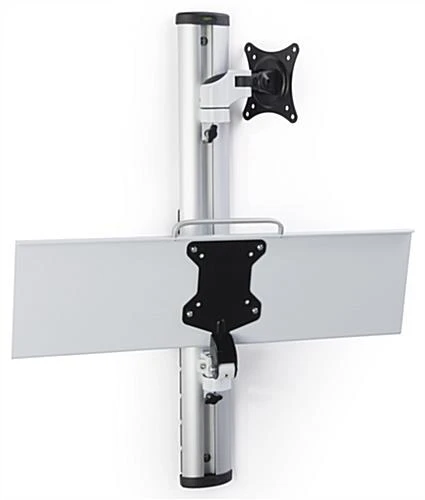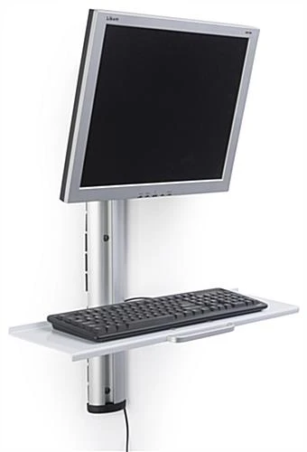 Built from durable aluminum this adjustable wall mount computer station poses to be a workhorse in your office for years to come. A height adaptable bracket and tray allow this sit stand workstation to conform to any user for an ergonomic experience. This silver computer station also features integrated cable management to hide unappealing wires in your office, warehouse, or medical facility. The bracket tilts, rotates, and swivels to offer a pleasing ergonomic experience that helps reduce neck and back strain. Additionally, each computer station can hold monitors ranging from 15” to 27” in size with a weight of up to 17lbs. Use a height adaptable sit stand workstation in your office to increase productivity and get the most out of your day.