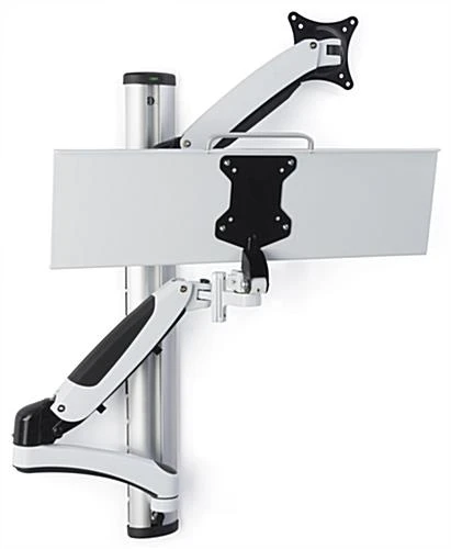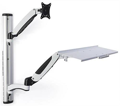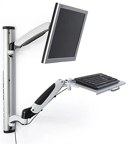 Incorporate this computer wall mount with keyboard tray into hospitals, doctor’s offices, and warehouses for an efficient sit and stand workstation. Featuring a silver aluminum frame, this swivel brakcet promises longevity even with daily use in highly trafficked areas. Each sit and stand computer wall mount with keyboard tray includes gas springs that allow the bracket and arms to seemlessly adjust to better suit each users needs. Additionally, the workstation supports are height adjustable throughout the column with fasteners that can quickly be modified. The bracket is capable of holding monitors up to 17.5 lbs ranging from 15” to 27” in size and can tilt, rotate, or swivel. Hide unsightly wires with the incorporated cable management that runs down the side and back of this monitor mount.